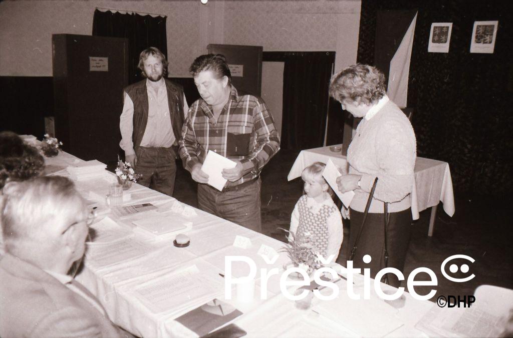 První polistopadové volby do Sněmovny lidu a Sněmovny národů Federálního shromáždění a do České národní radyv červnu 1990 měly v Přešticích téměř 99% účast. Vyhrálo v nich OF s celkově kolem 60% hlasů, druzí byli komunisté s průměrně 17% hlasů. V listopadu 1990 pak proběhly první komunální volby. OF v nich získalo 63,6% hlasů a 15 mandátů, KSČ 26,8% a 7 mandátů a Československá strana lidová 6,9% hlasů a 2 mandáty. V prosinci byl starostou města zvolen Vladimír Benda, kandidát OF. Zástupcem starosty byl zvolen Ing. Jan Korec, jeden ze zakladatelů OF v Přešticích, a tajemníkem MVDr. František Sikyta.Až do této doby vedl město předlistopadový předseda MěstNV...