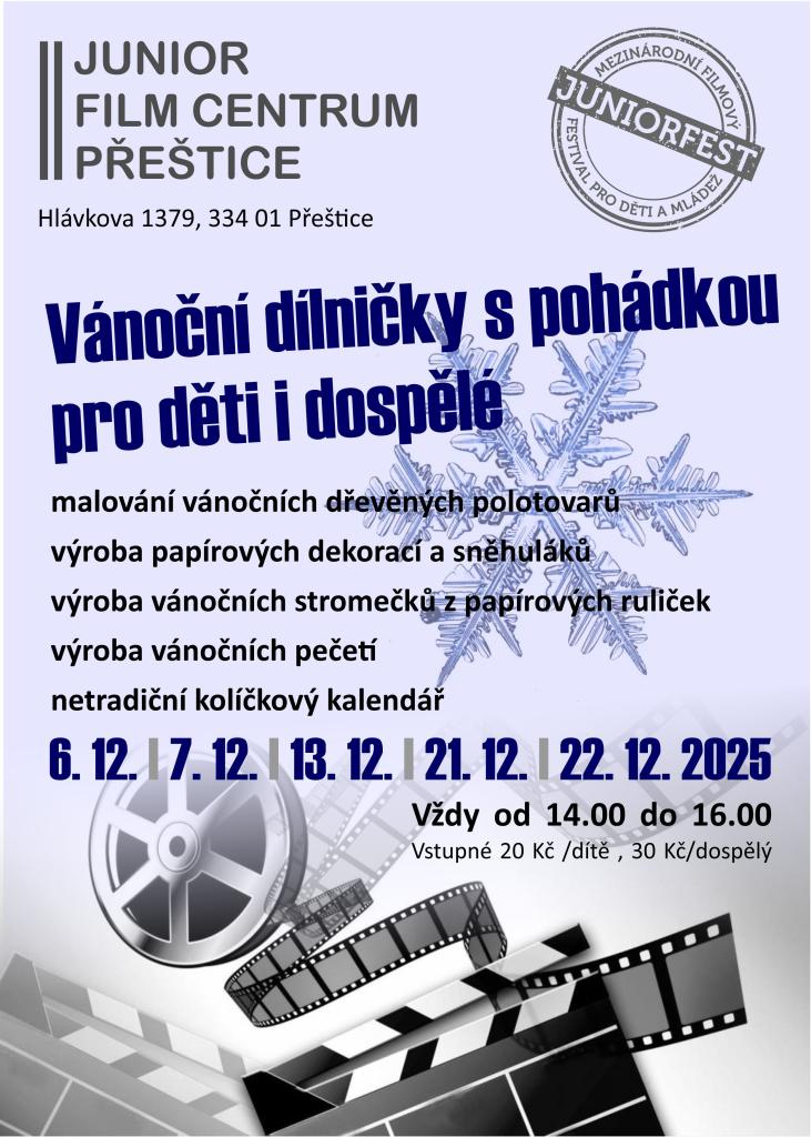 V JUNIOR FILM CENTRU Přeštice se od 6. do 22. prosince 2025 konají vánoční akce, které zahrnují výrobu vánočních předmětů spojené s promítáním pohádky. Přijďte si užít kreativní atmosféru a připravte se na Vánoce.